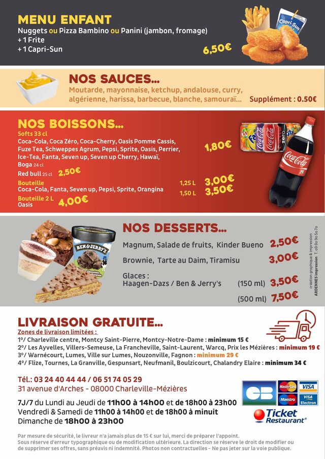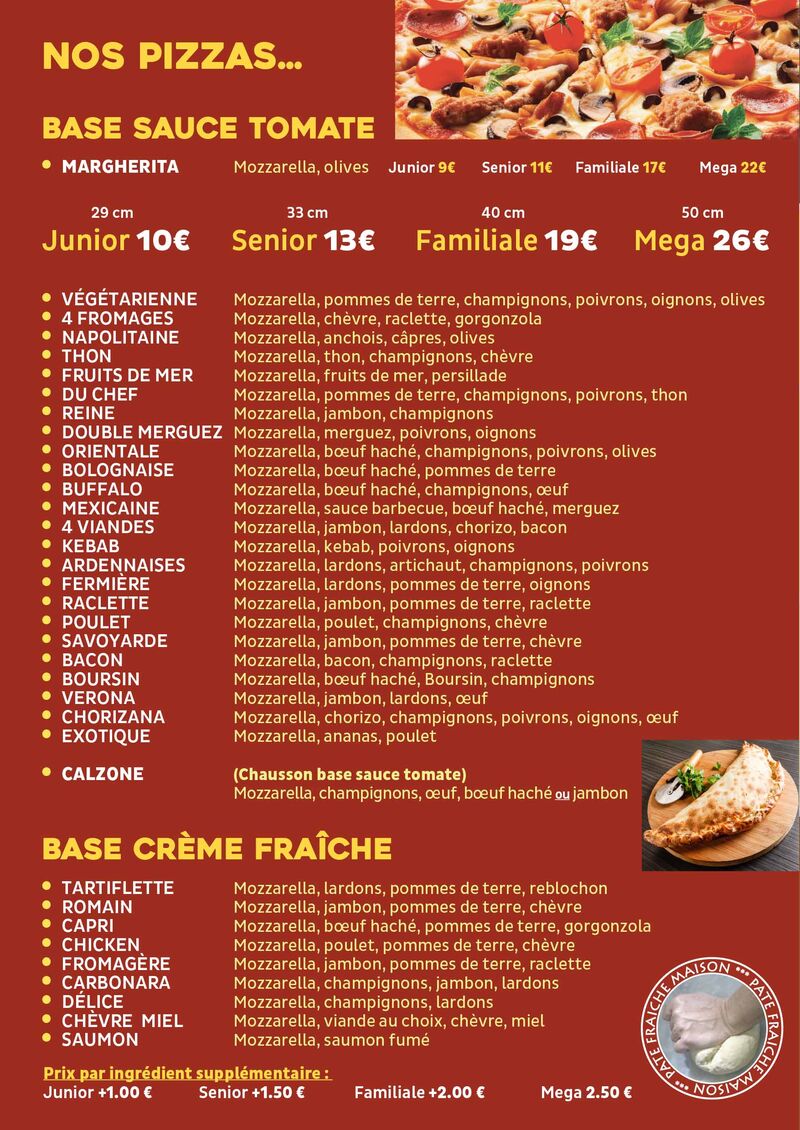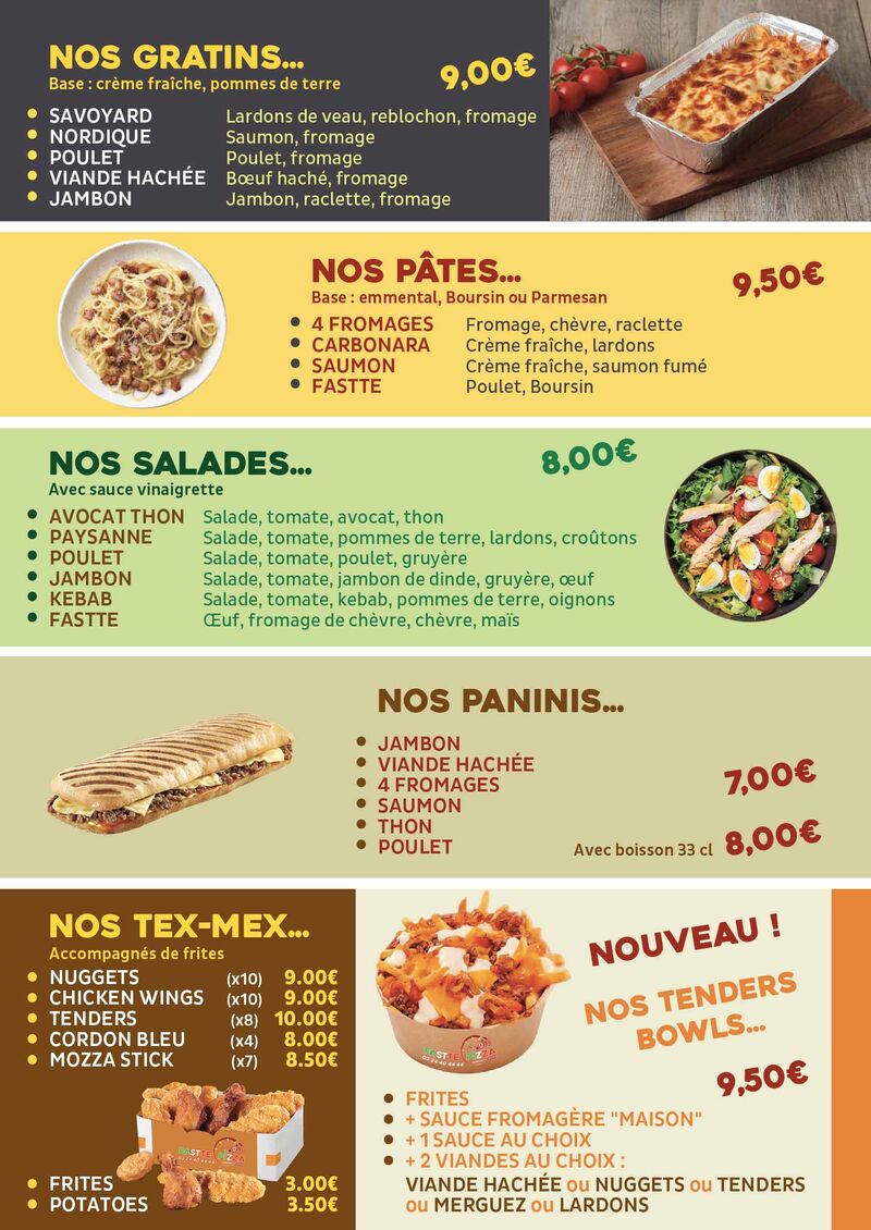 Chez nous vous trouverez des pizzas faites maison, des paninis, des pâtes, des nuggets, des wings, des gratins et des salades :-)